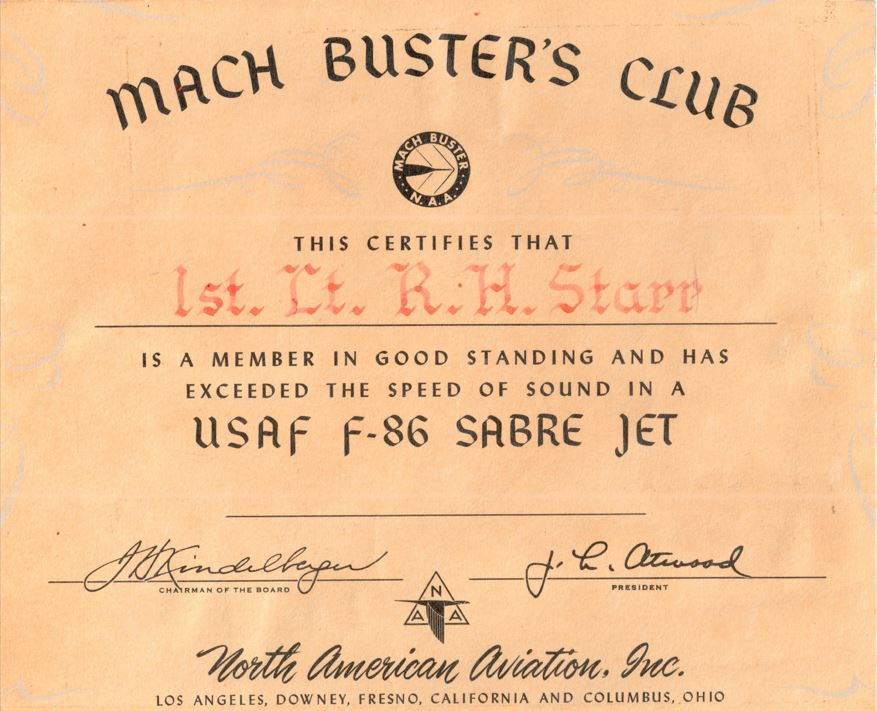 In 1954 I was presented with a certificate of membership in the Mach Buster’s Club by North American Aviation, Inc. for having flown the F-86 Sabre Jet faster than the speed of sound. That aircraft was pure power and it was a thrill to fly it. |